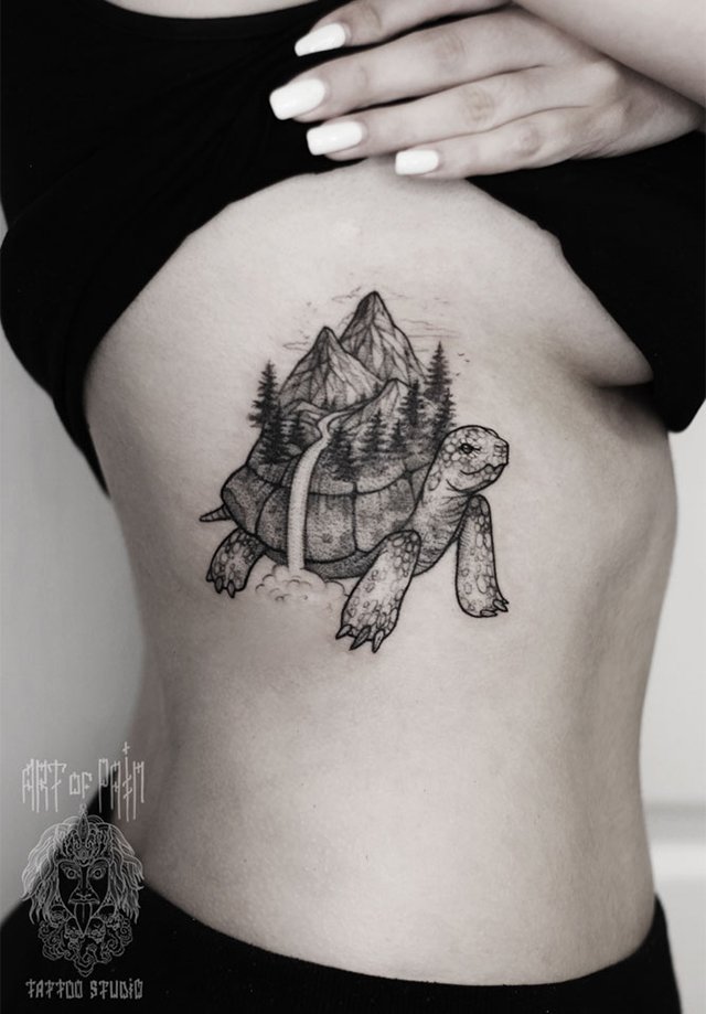 Татуировка женская графика на боку черепаха 3677