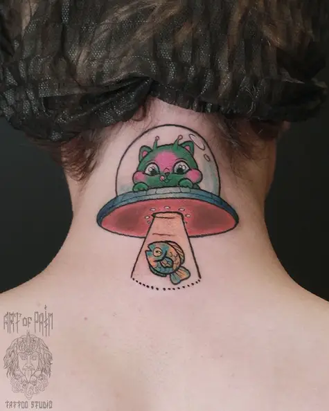 Татуировка женская олд скул на спине котик нло (Анастасия Родина) 3689