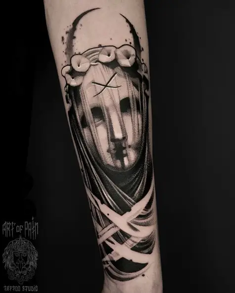 Татуировка женская графика на предплечье маска девушки (Анастасия Юсупова) 3806