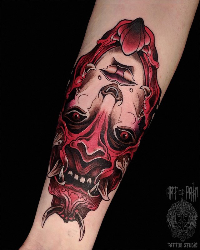 Татуировка женская нью-скул на предплечье девушка и черт 3854