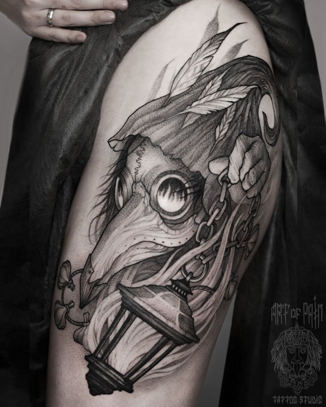 Татуировка женская графика на бедре чумной доктор 3863