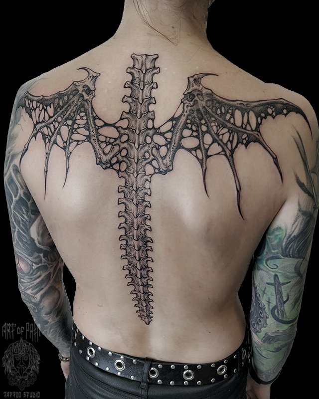 Татуировка женская графика на спине скелет 3975