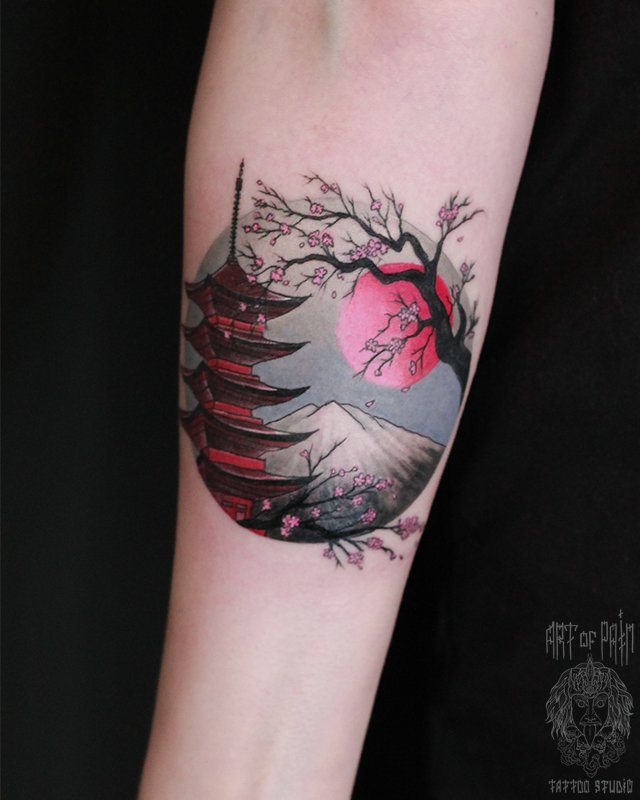 Татуировка женская нью-скул на предплечье сакура и пагода (Анастасия Родина) 3993