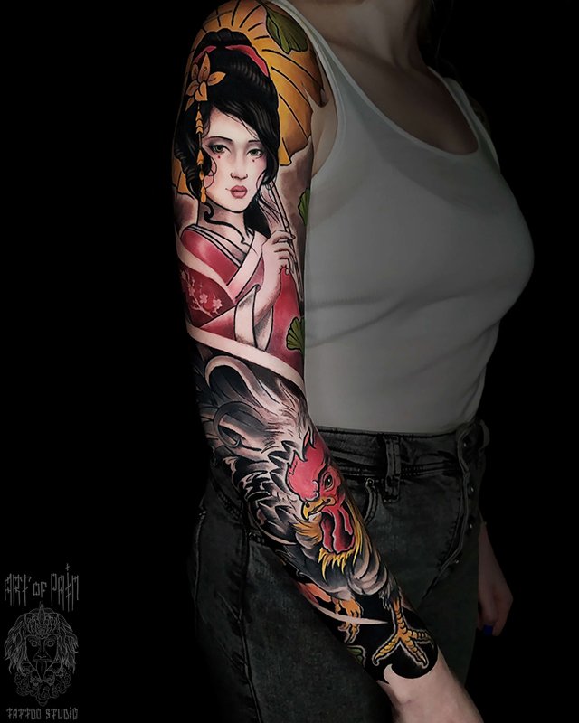 Татуировка женская япония тату-рукав гейша и петух 4023