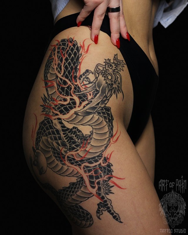 Татуировка женская япония на бедре дракон и языки пламени 4029