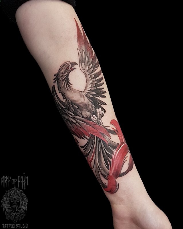 Татуировка женская фентези на предплечье феникс с красными перьями 4034