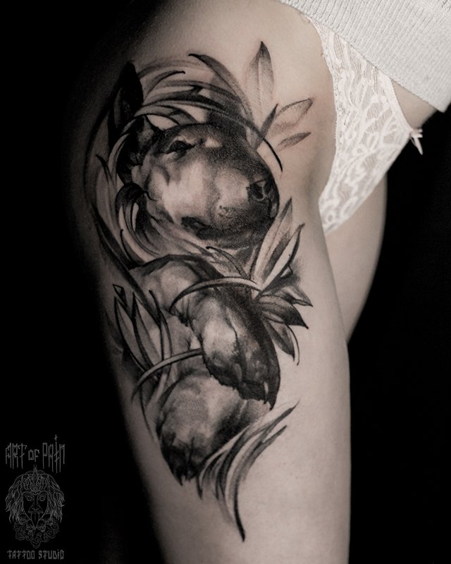 Татуировка женская реализм на бедре собака 4045