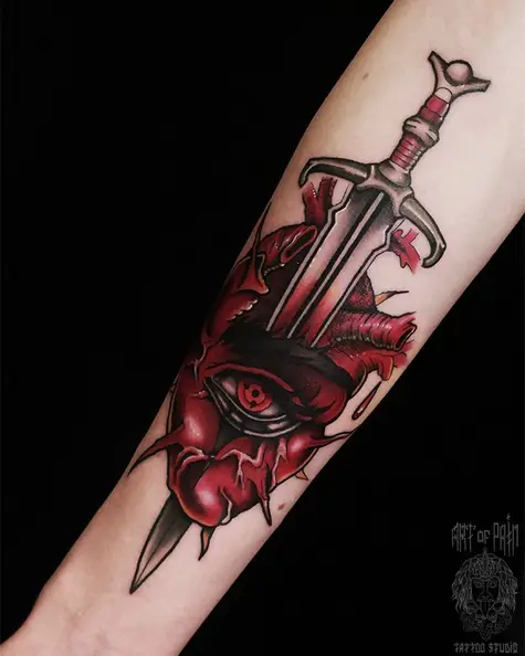 Татуировка женская нью-скул на предплечье сердце и кинжал 4055