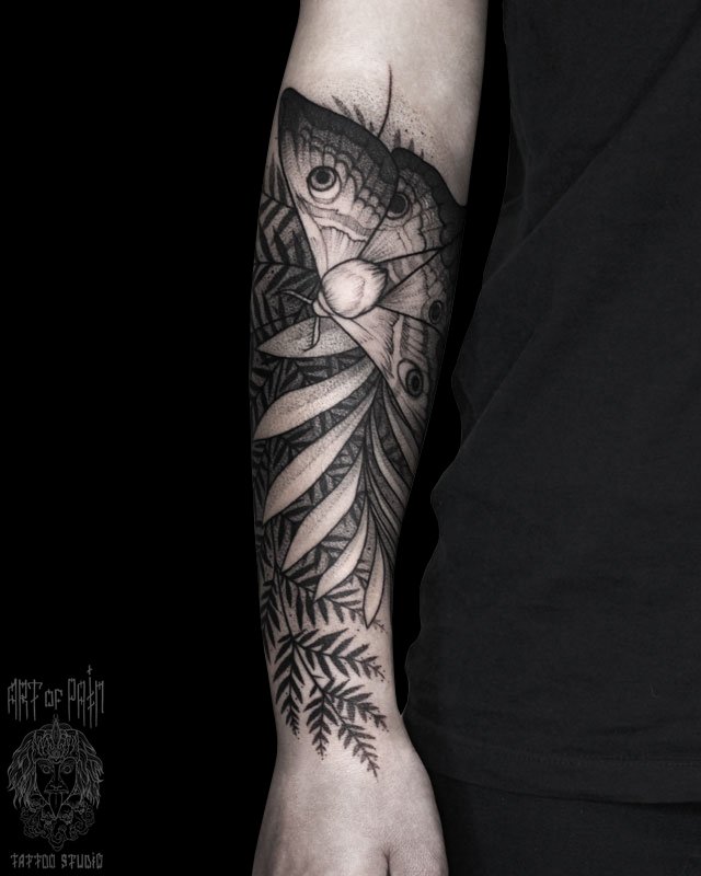 Татуировка женская графика на предплечье мотылек в папоротнике 4070