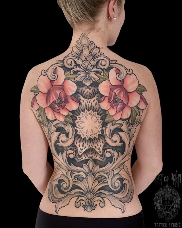 Татуировка женская орнаментал и япония на спине узор и пионы (Юрий Хандрыкин) 4074