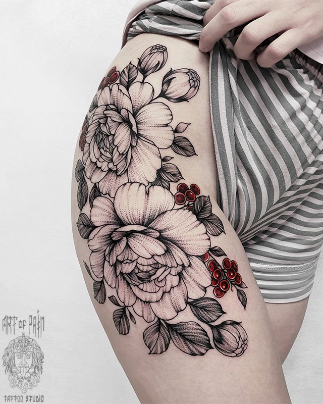 Татуировка женская графика на бедре цветы и ягодки 4129