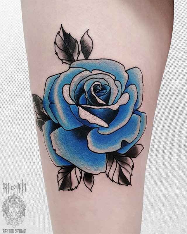 Татуировка женская нью-скул на предплечье синяя роза 4137