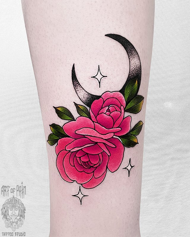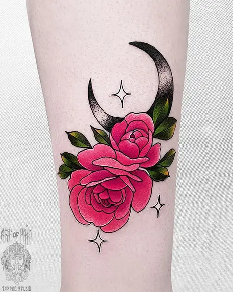 Татуировка женская нью-скул на голени роза 4147