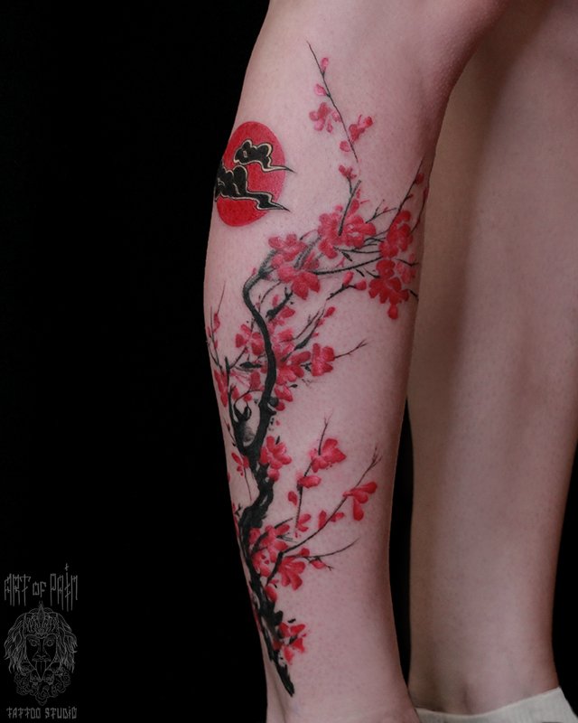 Татуировка женская нью-скул на голени сакура (Анастасия Родина) 4168