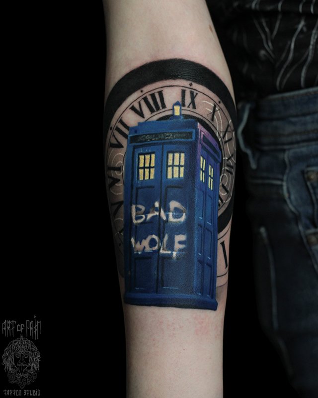 Татуировка женская реализм на предплечье телефонная кабинка и часы 4179