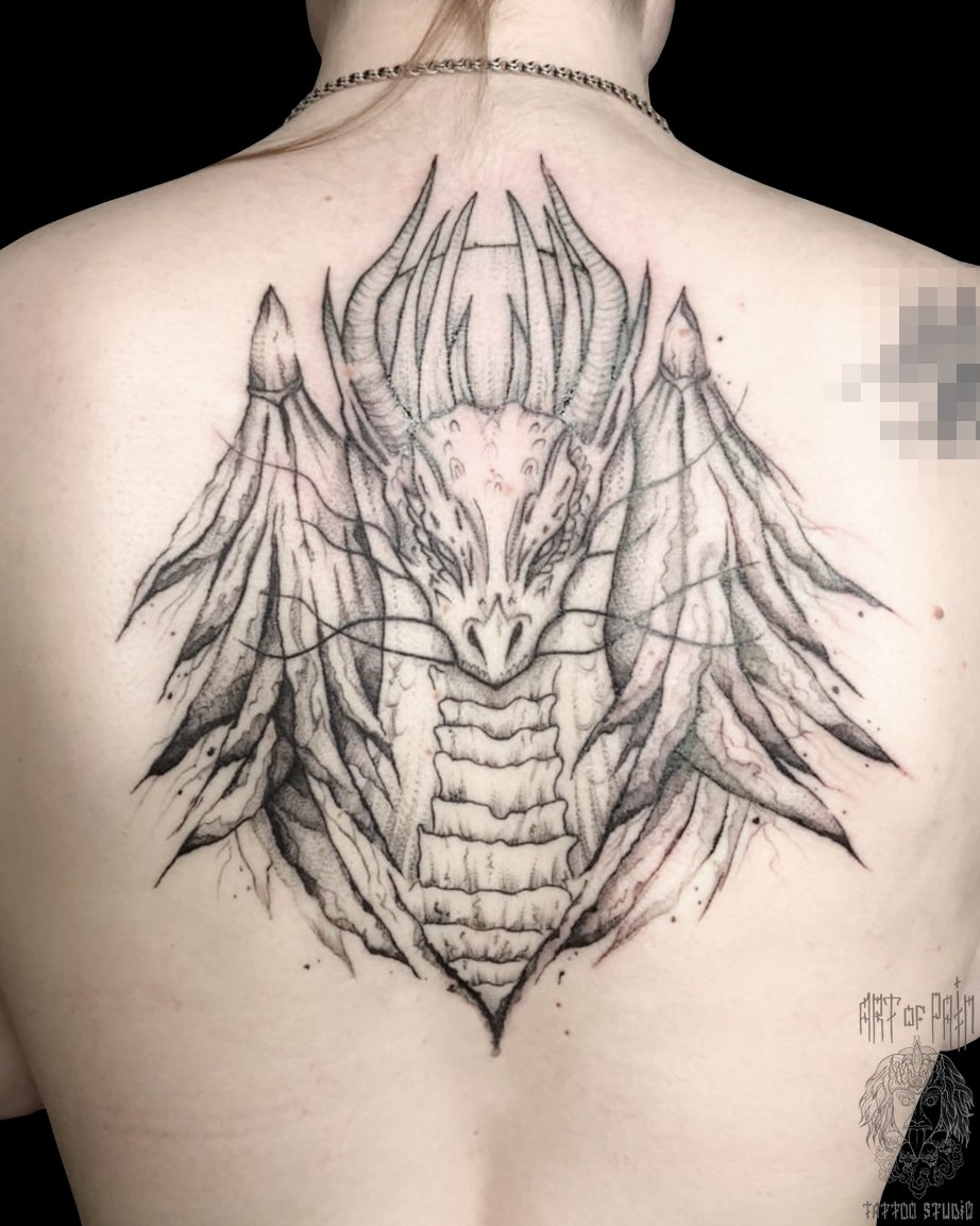 Татуировка женская графика на спине дракон (Мария Котова) 4230
