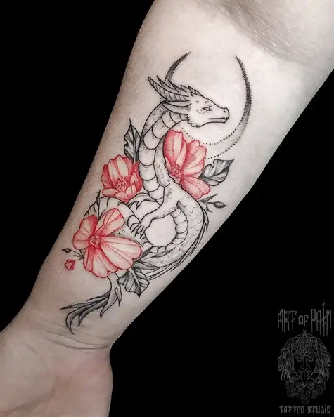 Татуировка женская графика на предплечье дракончик в цветах (Мария Котова) 4231