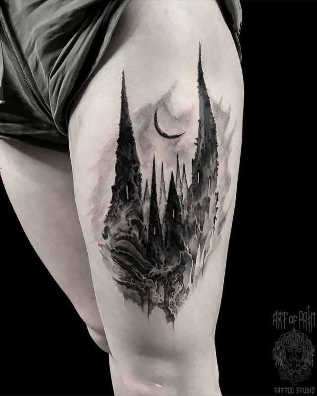 Татуировка женская хоррор на бедре замок 4269