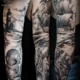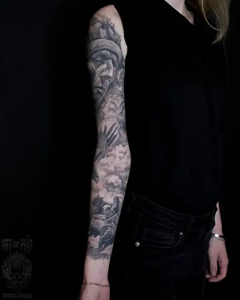 Татуировка женская реализм тату-рукав индеец и всадник 4372