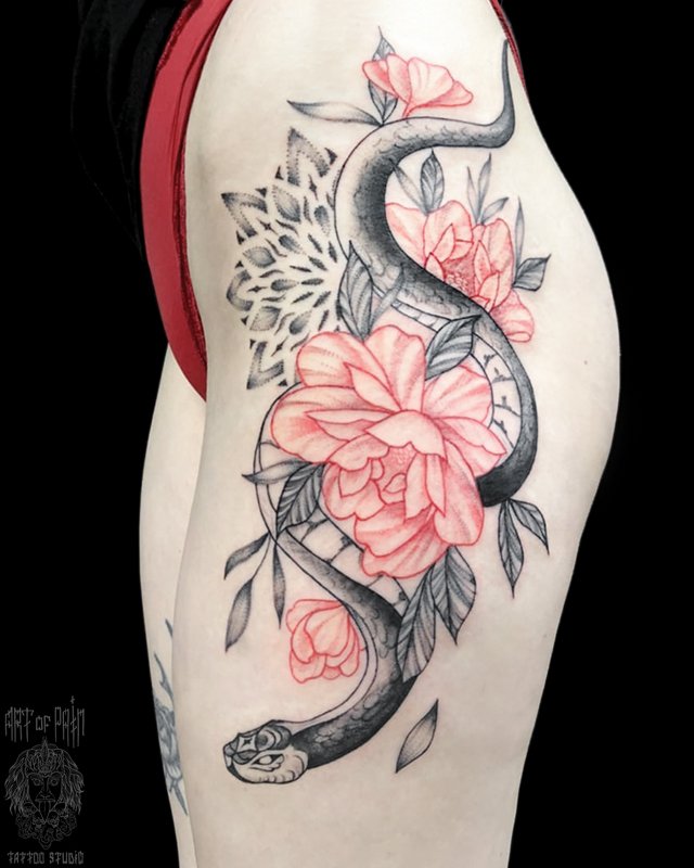 Татуировка женская графика на бедре змея и розовые цветы (Мария Котова) 4401
