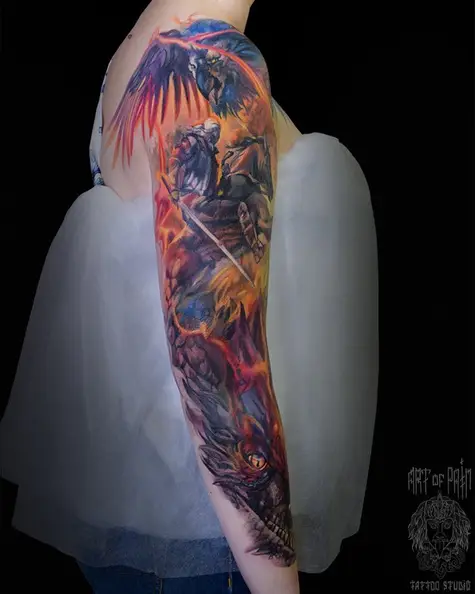 Татуировка женская фентези на тату-рукав всадник и дракон 4420