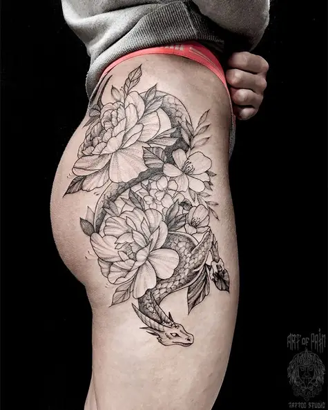 Татуировка женская графика на бедре дракон в цветах (Мария Котова) 4422