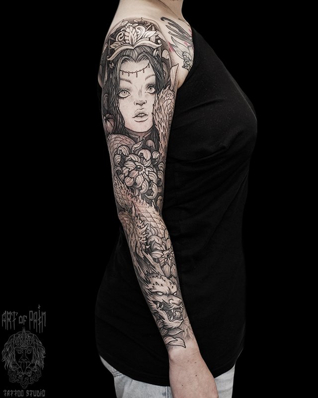 Татуировка женская графика и япония тату-рукав девушка и дракон 4477