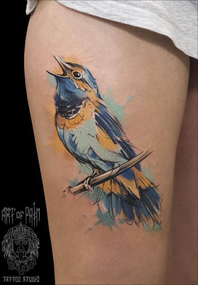 Татуировка женская акварель на бедре птица 450