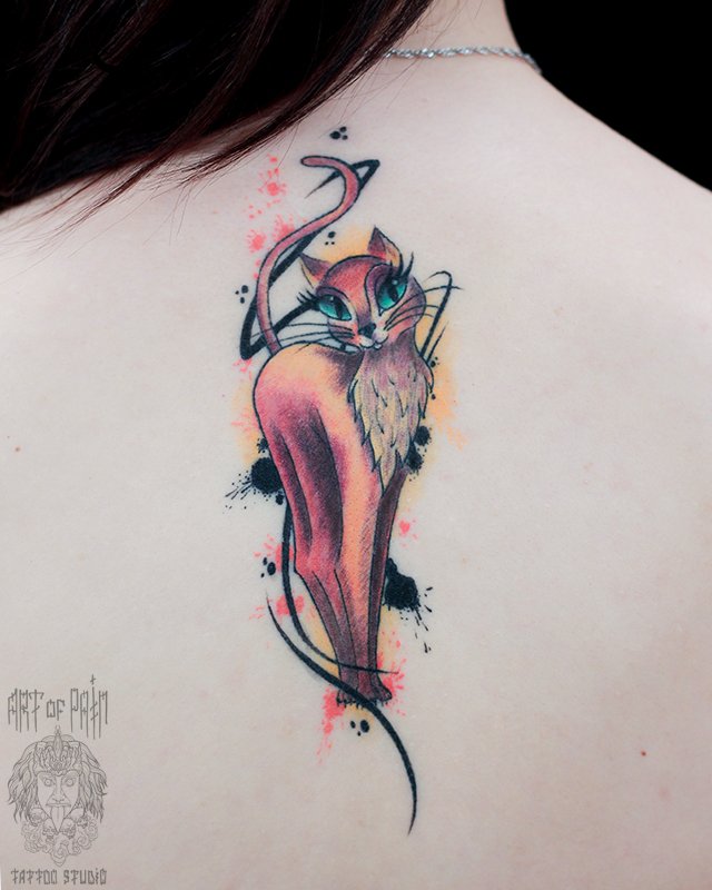 Татуировка женская нью-скул на спине кошка (Анастасия Родина) 4520