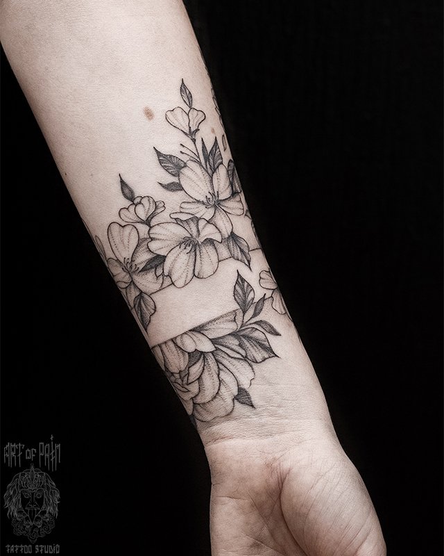Татуировка женская графика на предплечье цветы и браслет (Мария Котова) 4524