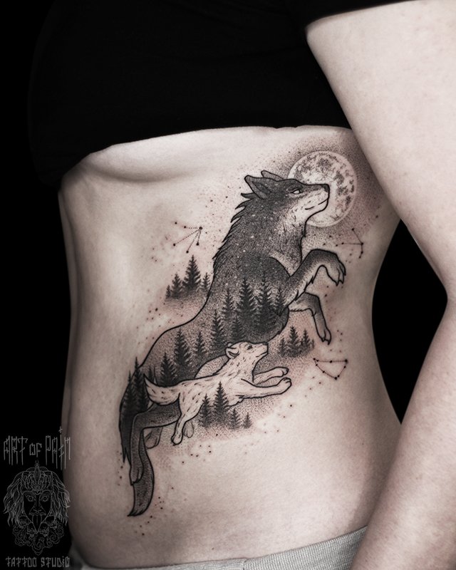 Татуировка женская графика на боку волчица и волченок 4609