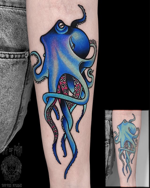 Татуировка женская нью-скул на предплечье осьминог 4627