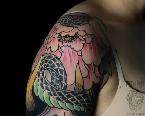 Татуировка женская япония на плече змея, пионы 4639