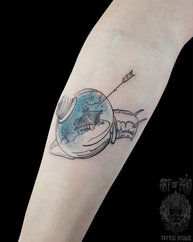Татуировка женская графика на предплечье улитка, дом 4655