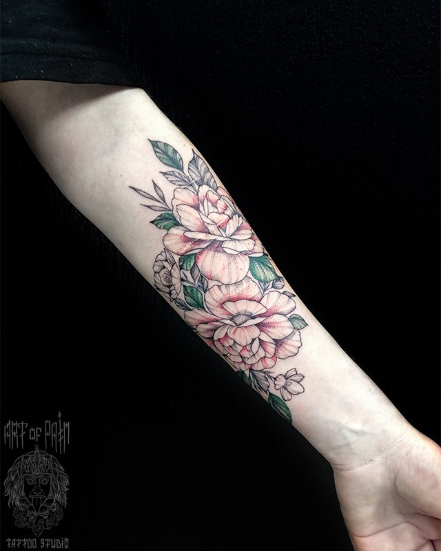 Татуировка женская цветная графика на предплечье цветы (Мария Котова) 4686