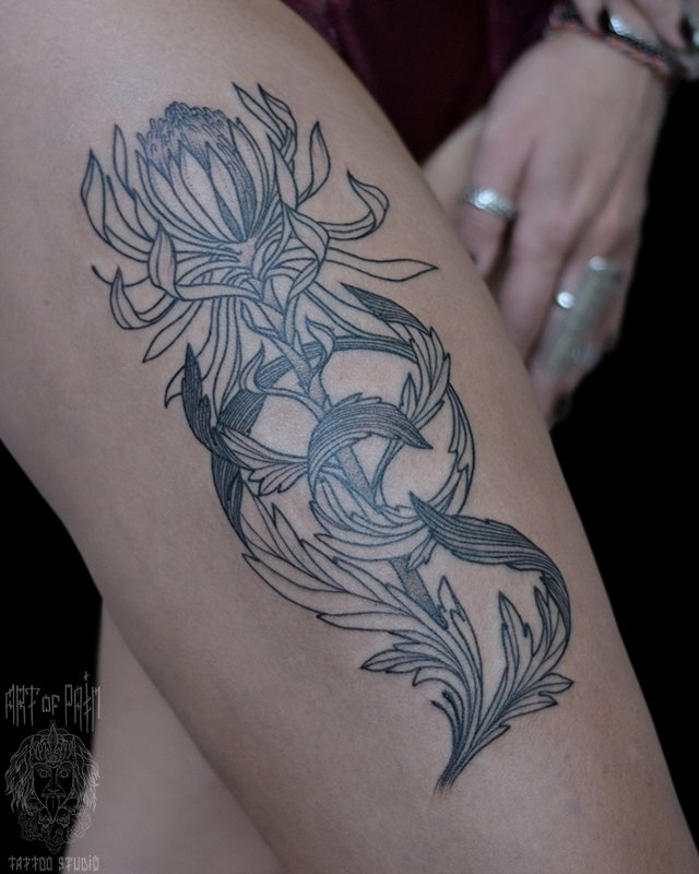 Татуировка женская графика на бедре цветок (Надежда Полякова) 4732