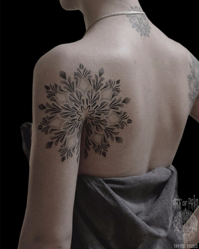 Татуировка женская графика на плече и на лопатке мандала (Надежда Полякова) 4746