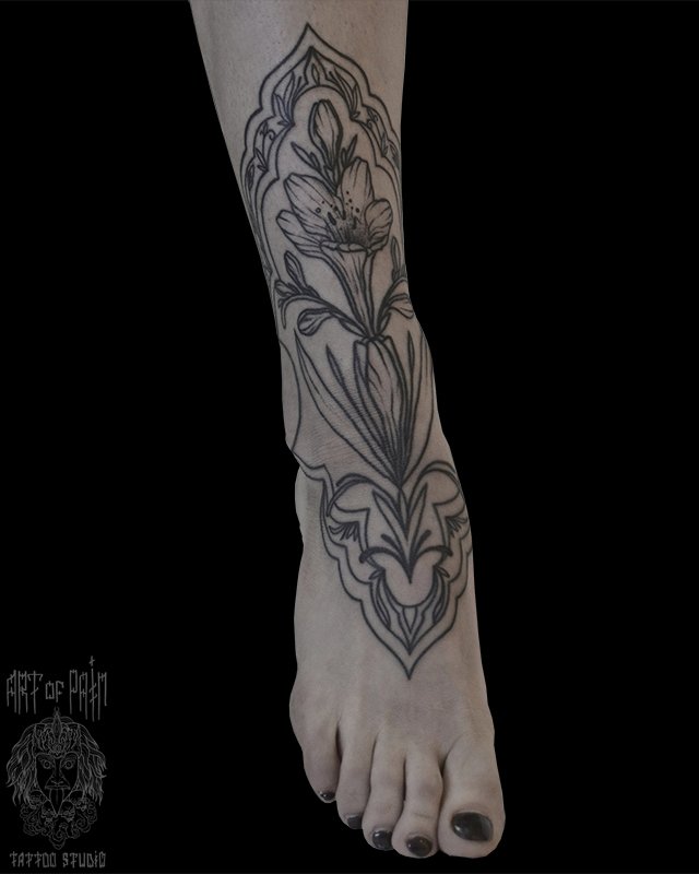 Татуировка женская графика на щиколотке орнамент с цветком (Надежда Полякова) 4750