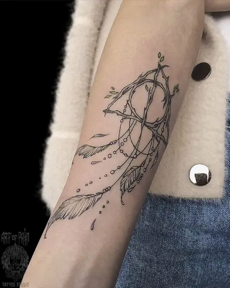 Татуировка женская графика на предплечье ловец снов из веток 4767