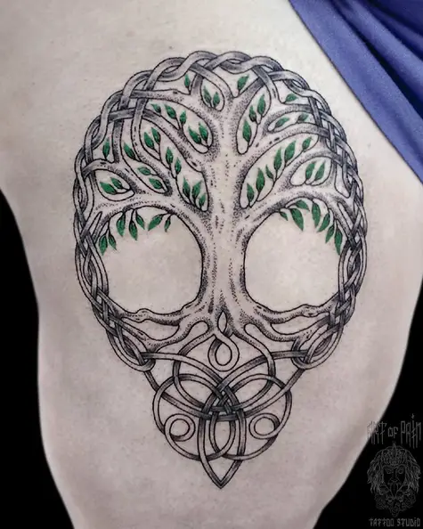 Татуировка женская графика на бедре дерево (Николай Орф) 4891