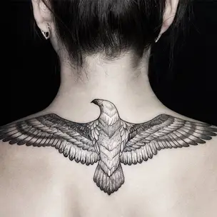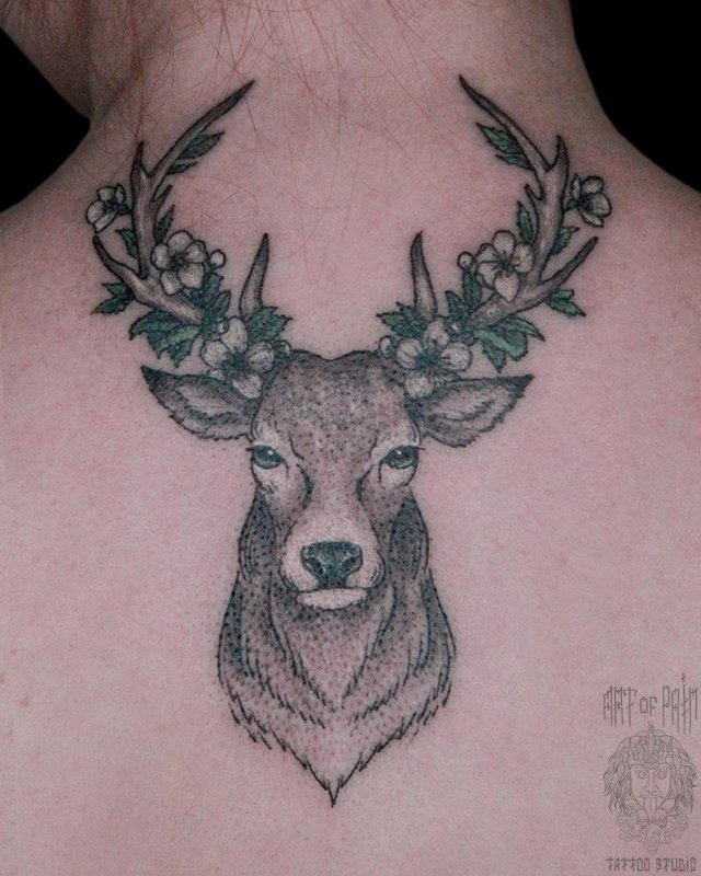 Татуировка женская графика на спине олень (Анастасия Родина) 4904