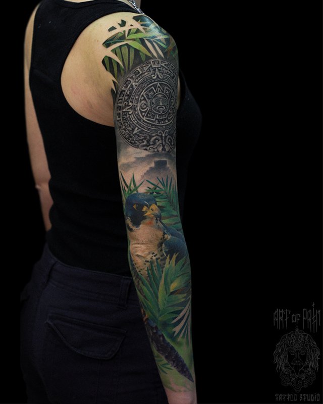 Татуировка женская реализм тату-рукав сокол, календарь Майя 4935