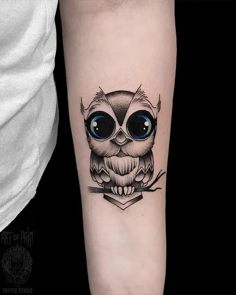 Татуировка женская графика на предплечье сова с синими глазами 4958