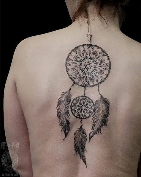 Татуировка женская графика на спине ловец снов (Надежда Полякова) 5034