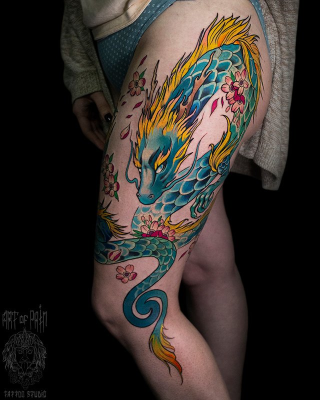 Татуировка женская нью скул на бедре зеленый дракон 5056