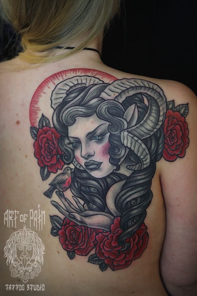 Татуировка женская нью скул на лопатке овен (Ольга Добрякова) 505