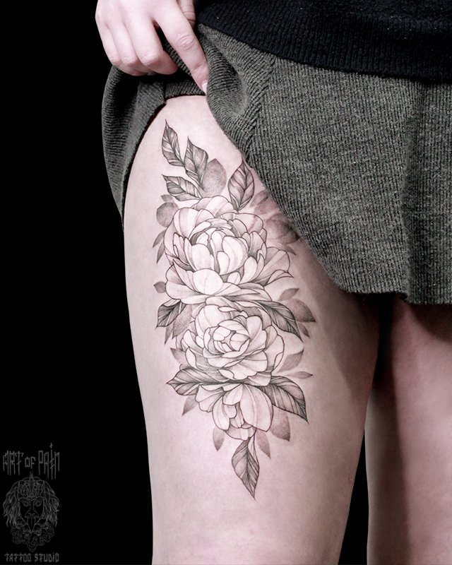 Татуировка женская графика на бедре цветы пионов 5130