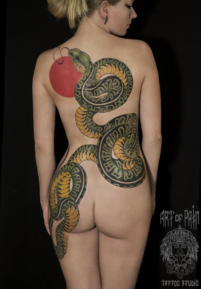 Татуировка женская Япония на спине змея и Солнце (Ольга Добрякова) 515
