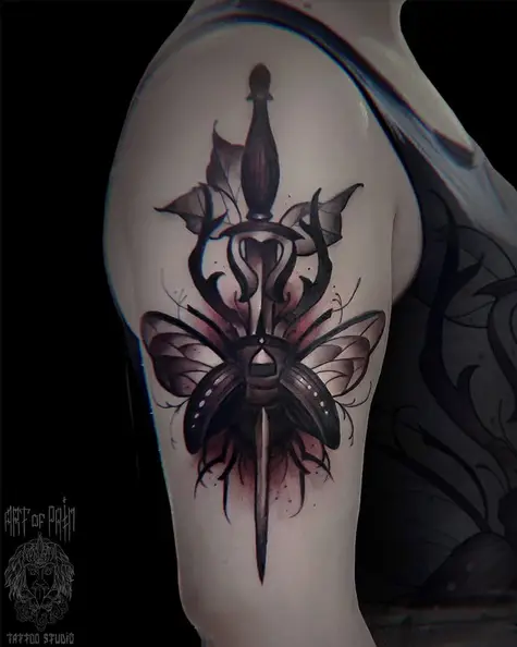 Татуировка женская нью скул на плече кинжал 5186