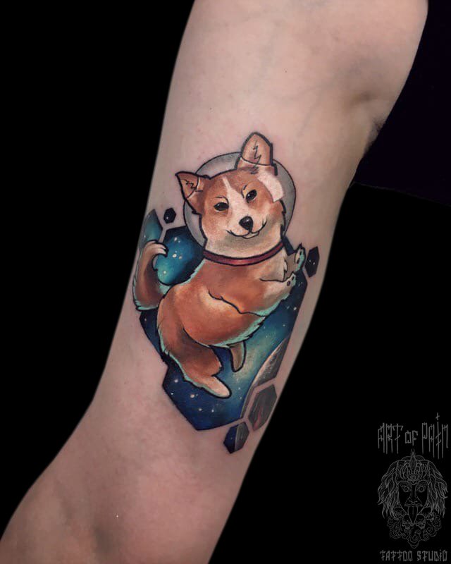 Татуировка женская нью скул на руке космос, собака 5187
